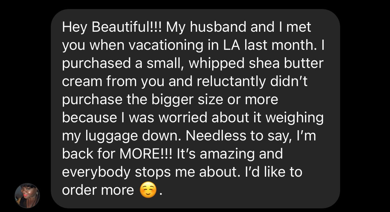 I purchased my first container of the body butter after meeting the owner at a Flea Market. She was professional and so kind! I used my first jar until I was literally scraping the bottom of the container. It has helped with hyperpigmentation on my legs and it keeps me moisturized for a full day. Also LOVE the scent. I get compliments when I use it!